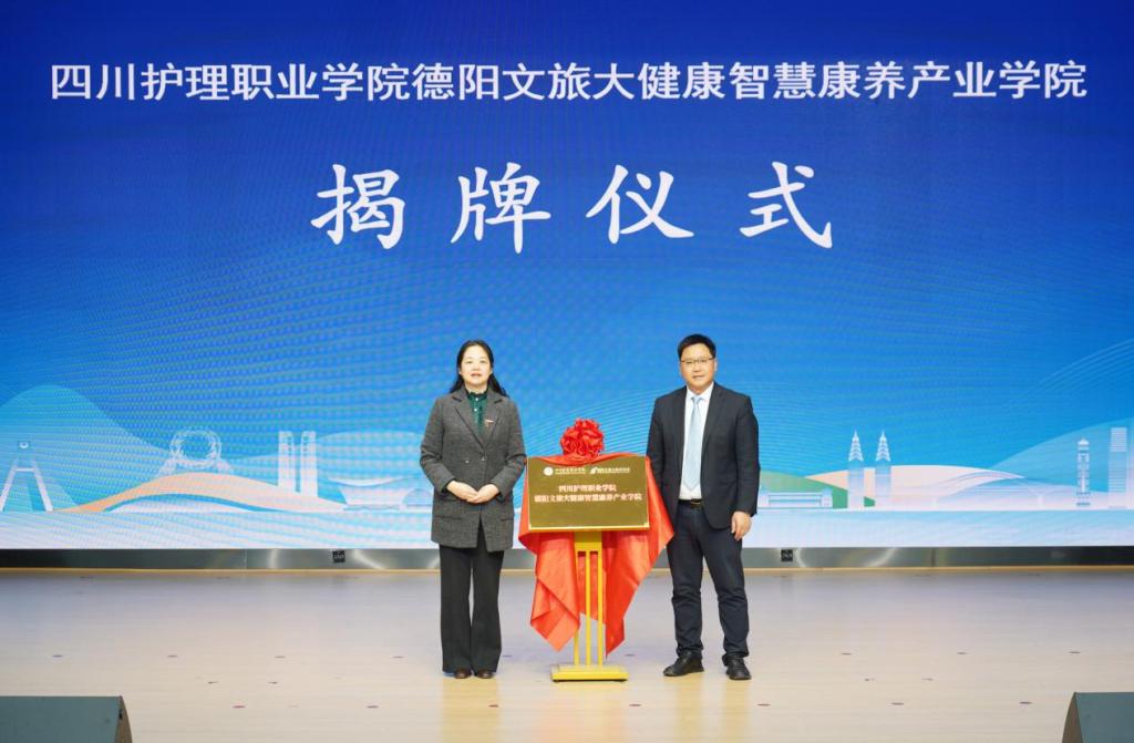会上,揭牌成立了西部首个智慧康养产业学院——四川护理职业学院德阳文旅大健康智慧康养产业学院,举行了共同体、联合体和联盟2025年度科普作品颁奖仪式和科研项目申报指南发布仪式,并为现代智能大健康服务产教融合共同体副理事长单位、学院博音听力和美丽一生产教融合实训基地授牌